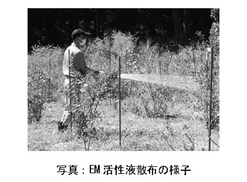 約20a のブルーベリー農園内に,EM 活性液を散布する「EM 区」及びEM 散布に有機物施用を組合せた「EM+ 有機物区」を設定し,「EM 区」と「EM+ 有機物区」に隣接する場所に何も散布しない「対照区」を設定し試験を実施した。