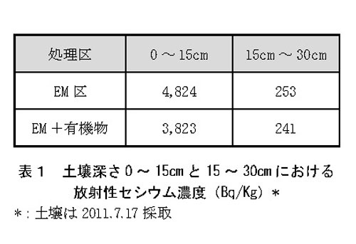 この測定結果は,放射性セシウムは土壌中の粘土粒子等と強く結合し耕起していない圃場の場合には,表面から2.5cm の深さに95%が留まるという農林水産省の報告とも合致していた。しかしながら,自然に土壌中の放射性セシウムが2 カ月間で75%近く減少することは考え難いことから,EM の働きにより土壌中の放射性セシウムが低減したと考えられる。現在は,更なる低減化に向けての技術開発とそのメカニズムの解明に向けて様々な試験を実施している(EM 研究機構)。![]()