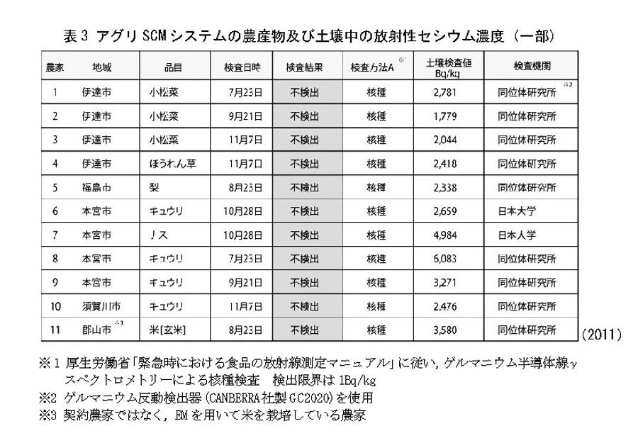 本件については結論的な結果が得られている。マクタアメニティーグループでは,1件の例外もなく,また,柴田農園以下,EM 栽培を本格的に行っている農園は,すべて検出限界以下(1ベクレル以下)となっている。注目すべきはEM 活性液を使用し,検出限界以下になった水田や畑地は,多収高品質となっているばかりでなく10a 当たり200 ~ 300 L の活性液の使用でも,再汚染の懸念が全くないということである。