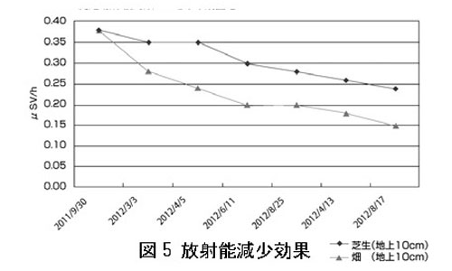 ⑥ EM を散布された周りの数メートルから数十メートルの放射線量も低下する。