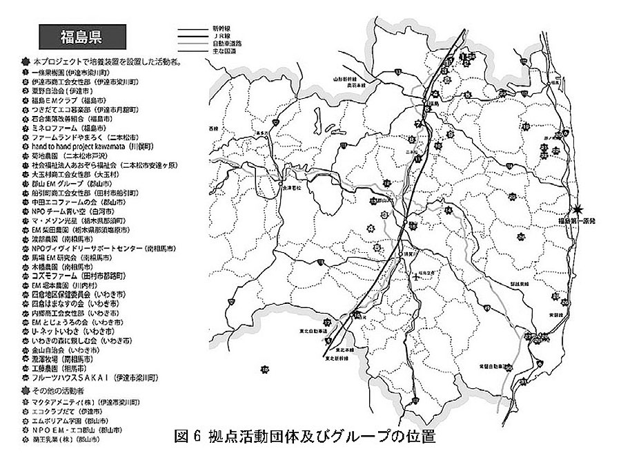 このような事例を踏まえ2013 年11 月現在,福島県を中心に拠点活動団体やグループは図6 に示すように38 カ所となりその活動は更に枝分かれ的に広がっている。![]()