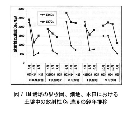 EM による放射能汚染の低減化を検証するため,飯館村のブルーベリー農園(約20a)にてEM 活性液を定期的に散布し試験を行った。試験開始直後の土壌の放射性Cs 濃度は,土壌1kg 当たり約20,000Bq であったが,2 カ月後には約5,000Bq まで減少し,約75%の低下が認められた。この時,深さ15 ~ 30cm の土壌の放射性Cs 濃度は約250Bq/kg であり,降雨による土壌深部への浸透・流出による低下ではないと考えられた。一方で,本試験ではEM 処理区に隣接した対照区でも放射性Cs 濃度が低下した理由は現在でも検討中である。しかしながら,自然放置して土壌中の放射性Cs が短期間で75%も減少する事象はこれまで報告されてないこと,15 年以上にわたりEM やEM 発酵堆肥を活用し土づくりを行ってきた農家(果樹園,畑作,水田)の土壌の放射性Cs 濃度の推移の調査結果(図7)でも,理論上の減衰値よりも放射性Cs が低下していることから,われわれは土壌中の有用微生物の活性が放射性Cs の低減になんらかの影響を及ぼしていると考えている。