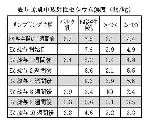 2012 年の春季に現地でとれた62 ~ 65 ベクレル/kg の牧草にEM 活性液を添加し飼育した原乳の放射性セシウムの結果は下記の表の通りである。バルク乳区は汚染牧草の使用を極力ひかえ放射性セシウムを5 ベクレル以下にするために行われた飼料設計によるものである。