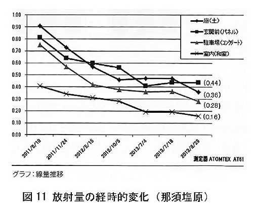 図11 は栃木県,那須塩原のホットスポット地帯でEM を散布している柴田氏宅の放射量の経時的変化である。